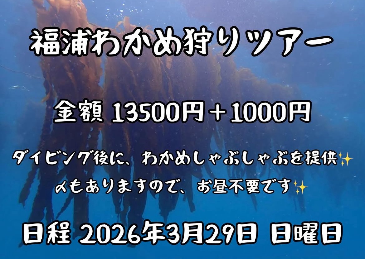 2026年3月1日 / 最終更新日 : 2026年3月1日 だいびんぐしょっぷ海家 イベント わかめ&昆布狩りツアー イベント詳細 このイベントは 1 3月 2026 から 29 3月 2026 まで開催しています。 次回の開催は 2026年3月29日 です。 カテゴリ: イベント 開催日: 2026年3月29日